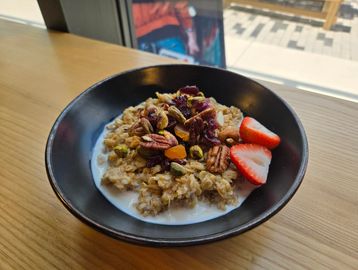 Steel-cut oats cooked with Ontario cream (or oat milk), topped with seasonal fruit, nuts & seeds, and warm spices.