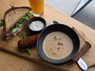 Half of an Uitsmijter sandwich, one buffalo kroketten, a side of soup & toast.