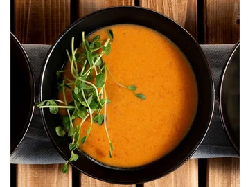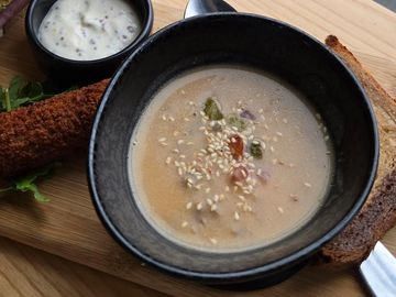 Dutch split pea soup - a rich puree of Ontario pork, split peas, local carrots, celery, and onions, finished with smoked Sikorski sausage and rye croutons.