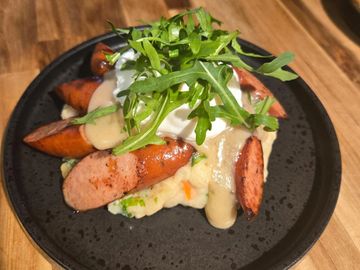 Creamy mashed Ontario potatoes folded with wilted kale, topped with a seared local pork sausage, soft-poached egg, and mustard-herb gravy.