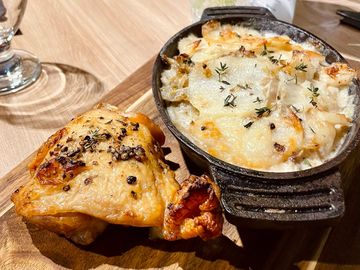 Ontario chicken thighs braised in local apple cider with parsnips, carrots, leeks, and thyme. Served with creamy mashed potatoes and pan jus.