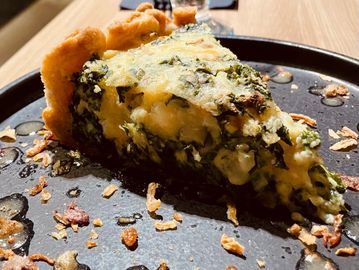 A rustic tart filled with kale, mashed Ontario potatoes, roasted garlic, and smoked local gouda, baked in a buttery crust. Served with a mustard seed vinaigrette and crispy onions.