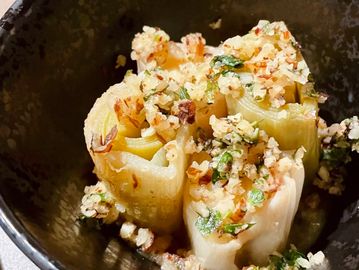 Ontario leeks braised until tender, topped with parsley-hazelnut gremolata and a drizzle of brown butter.