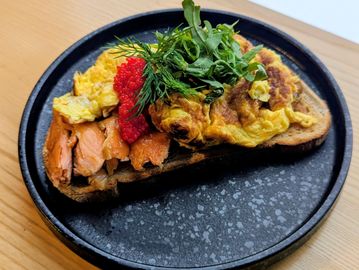 Soft scrambled eggs with hot-smoked locally farmed trout, fresh dill, chives, and lemon zest. Served with toasted sourdough and caviar.