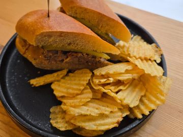 Dutch Meatball Sandwich. A house-made pork and buffalo meatball, braised in rich gravy, served on a soft bun with mustard, pickles, and crispy onions. Served with chips.